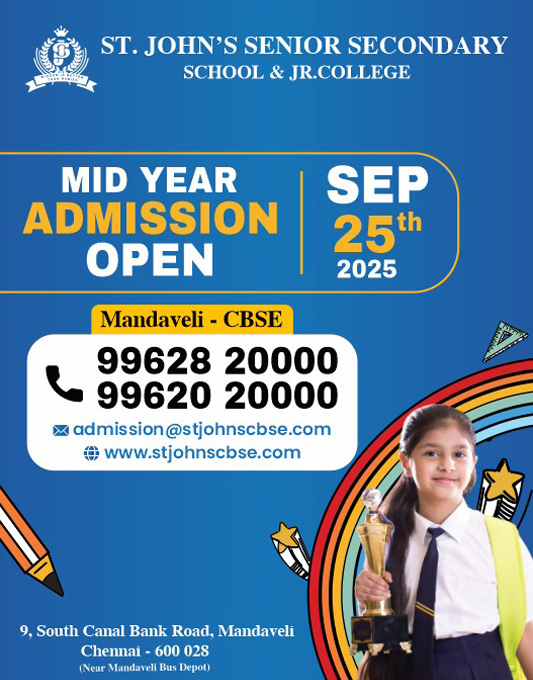 St. John’s Injambakkam School, Injambakkam. This school is the sister concern of St.John’s Senior Secondary School, Mandveli. It is located at Injambakkam, East Coast Road, Chennai. It is a Matriculation School started in the year 2010 with innovative and emerging trends